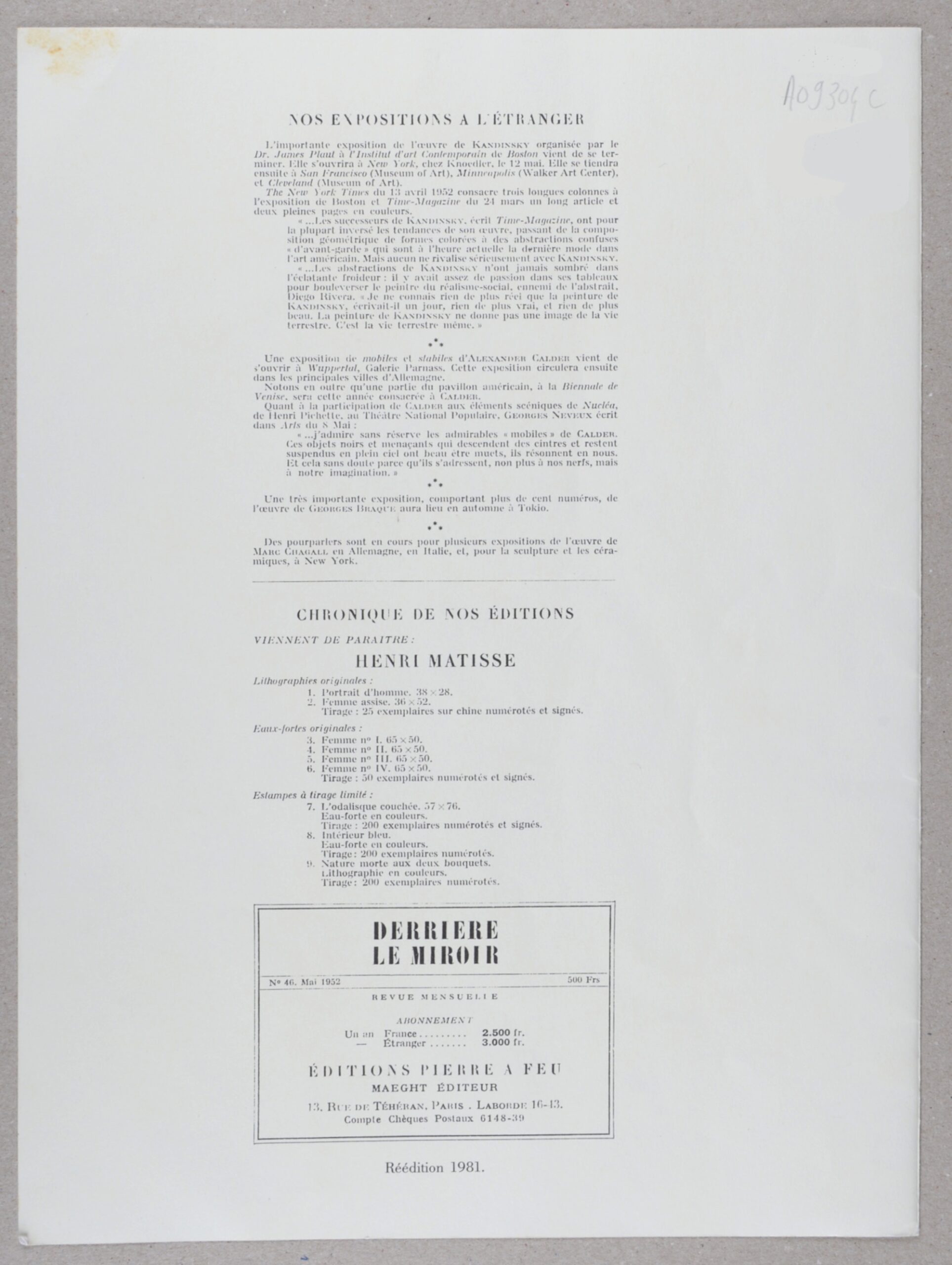 Cette estampe provient de la réédition de Derrière le Miroir publiée en 1981, avec un texte en français au verso.